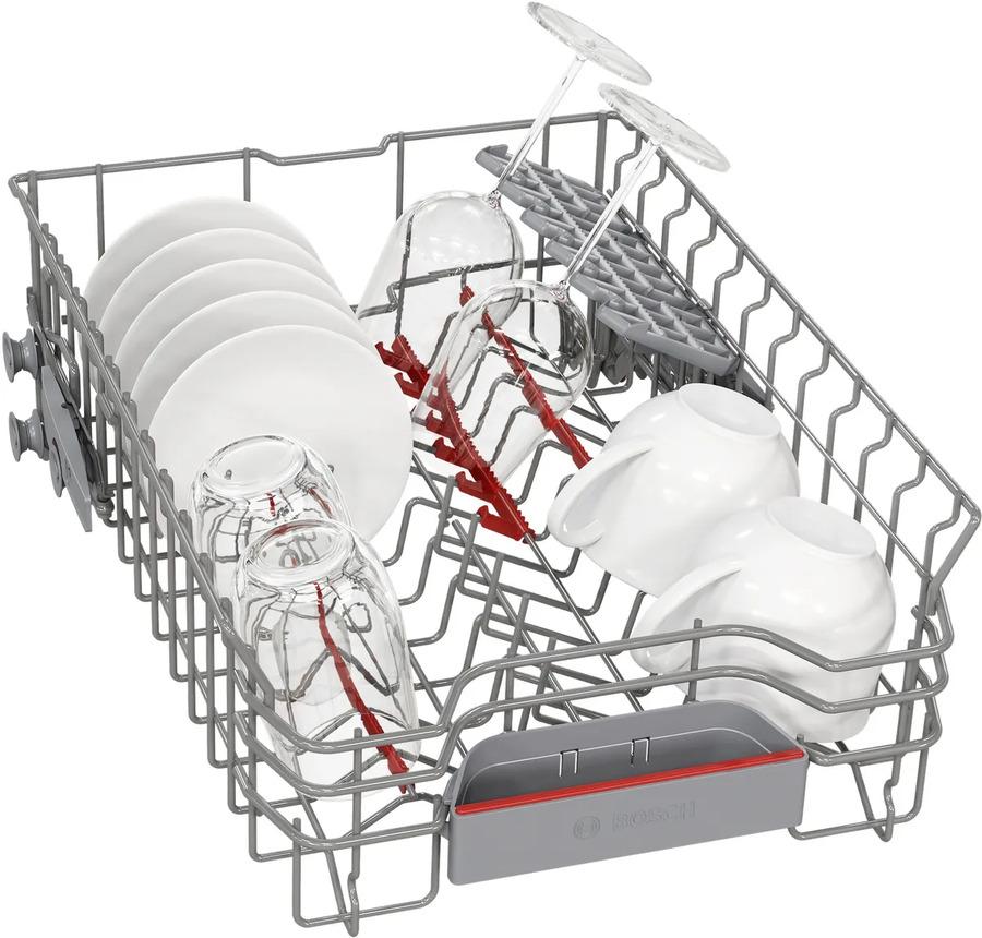 Bosch SPV6EMX65Q обладает шириной всего 44,8 см, встраивается в нишу размером 81,5-87,5х45х55 см. При скромных габаритах позволяет за один раз очистить до десяти комплектов посуды. Для ее размещения используются три корзины и полочка для чашек. Высоту верхнего короба можно менять.