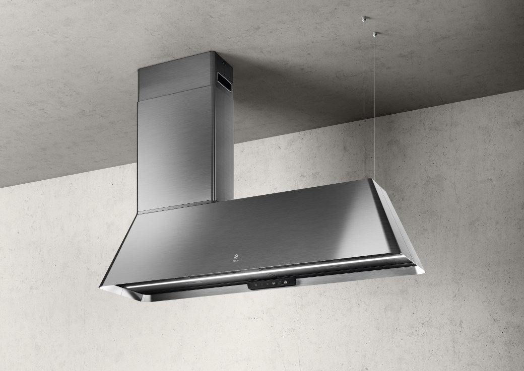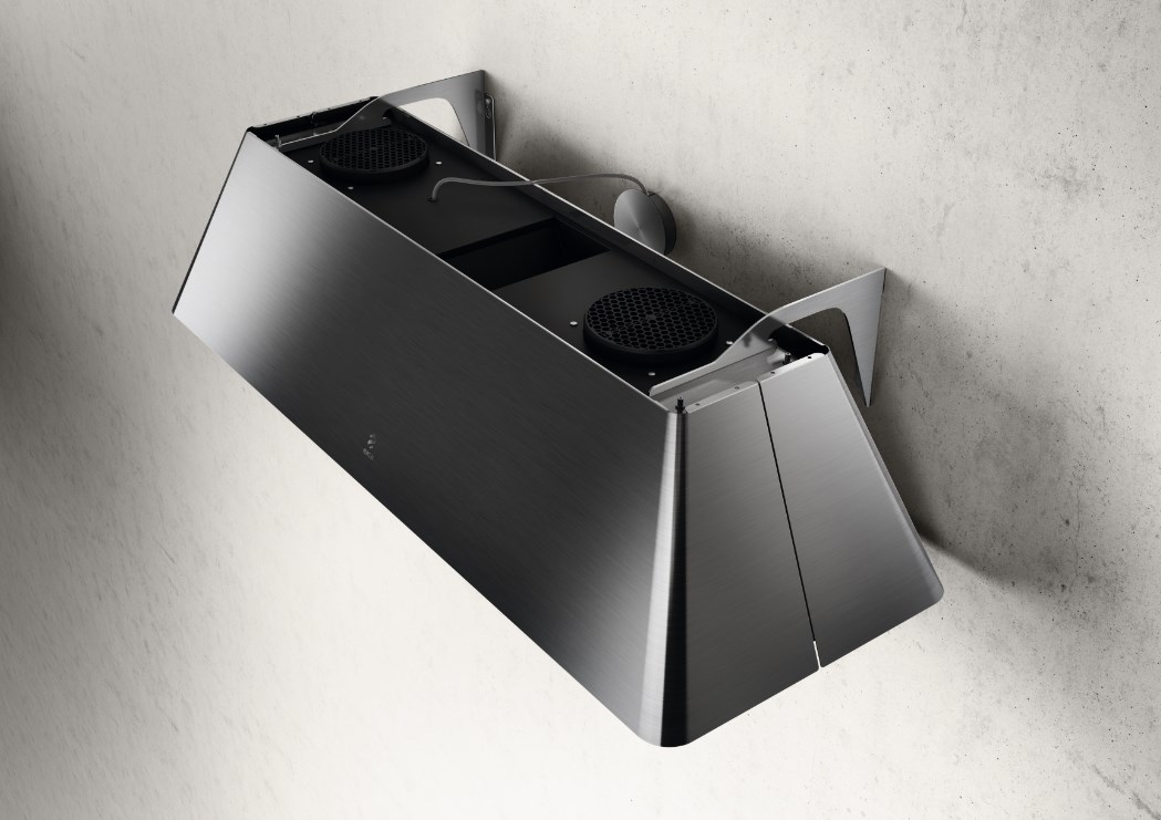 Ikona Maxxi Pure доступна в черном цвете с эффектом soft touch или с отделкой из нержавеющей стали и предлагает широкий выбор способов установки: отвод воздуха или фильтрация, настенное или подвесное крепление, с вытяжной трубой, которую можно расположить с права или слева, или же без нее.