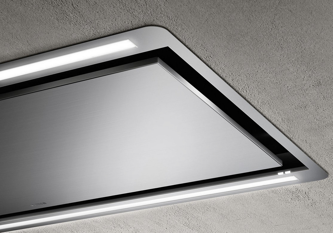 Заподлицо с потолком, красивая панель из нерж. стали с двумя элегантными светодиодными панельками хитроумно скрывает мощную и бесшумную систему вытяжки, разработанную так, чтобы гарантировать максимальную производительность даже на значительном расстоянии от варочной панели.