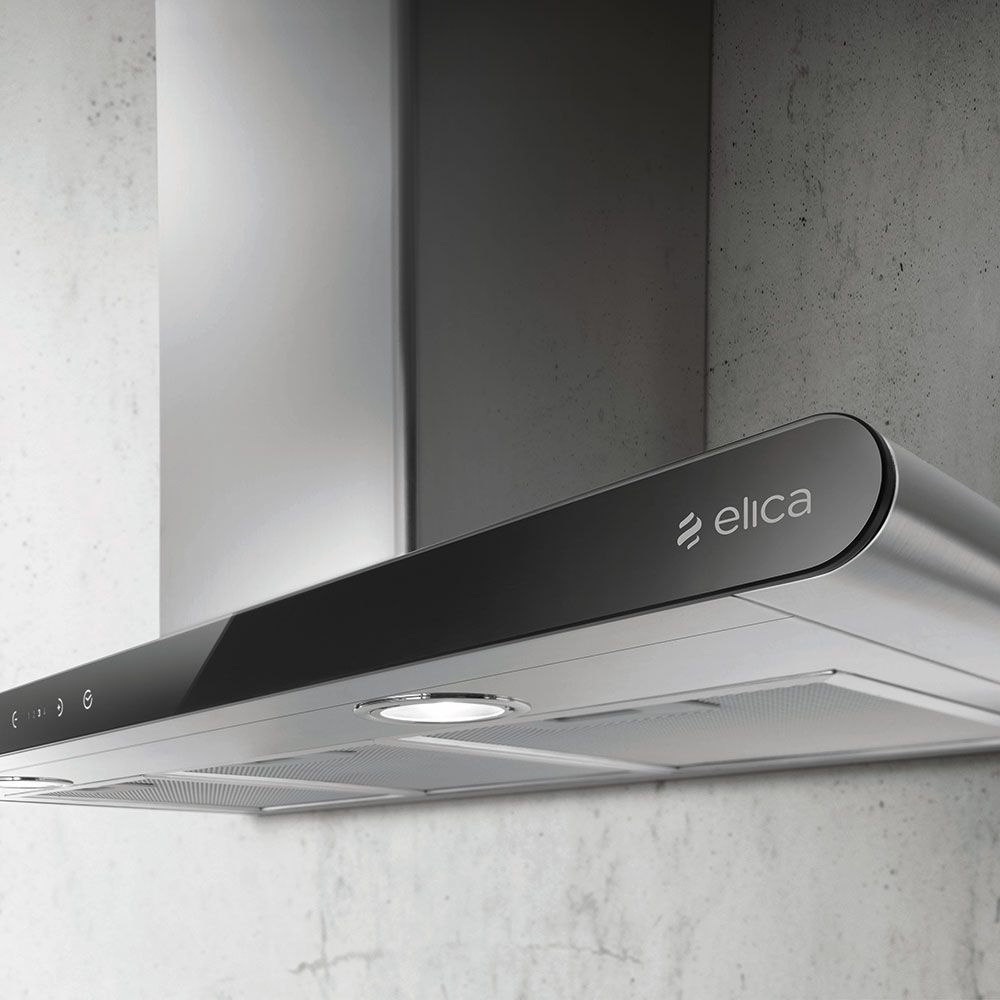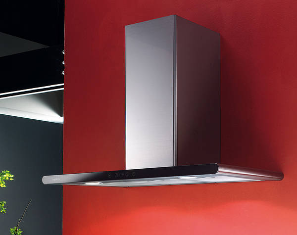 Вытяжка крепится на стену, а форма буквой «Т» создаст дополнительное место для хранения в виде полок по бокам от короба.