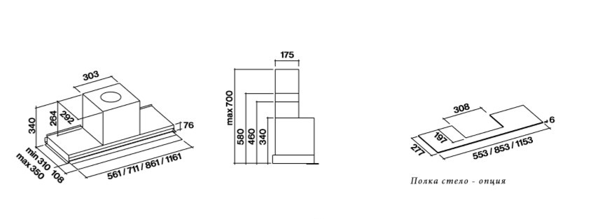 - Вытяжки встраиваемые и подвесные, шириной не более 60 см