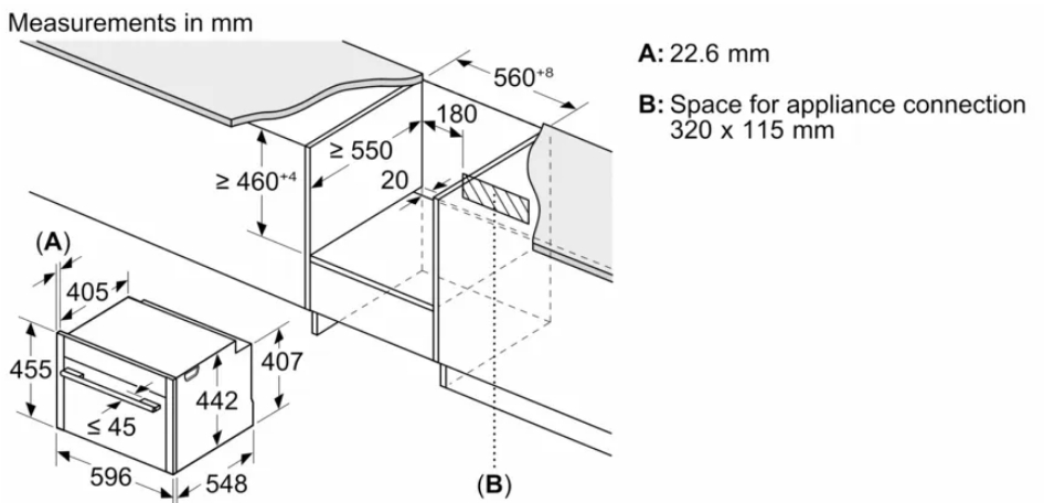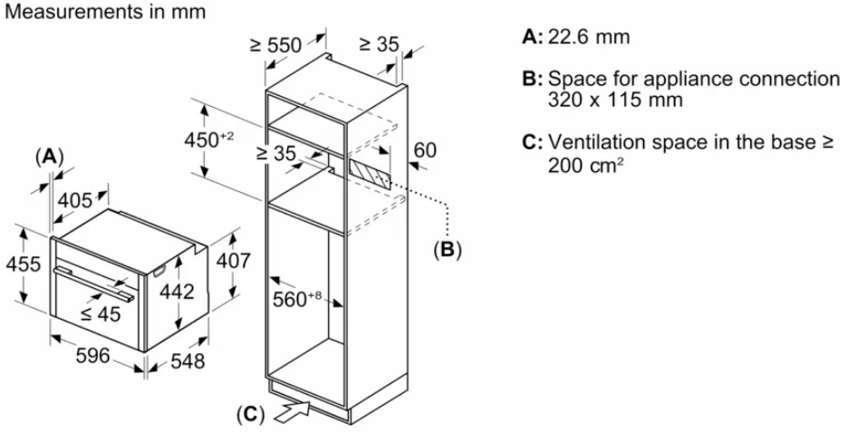 - Размеры ниши для встраивания, см (В х Ш х Г): 45-45.5 х 56-56.8 х 55