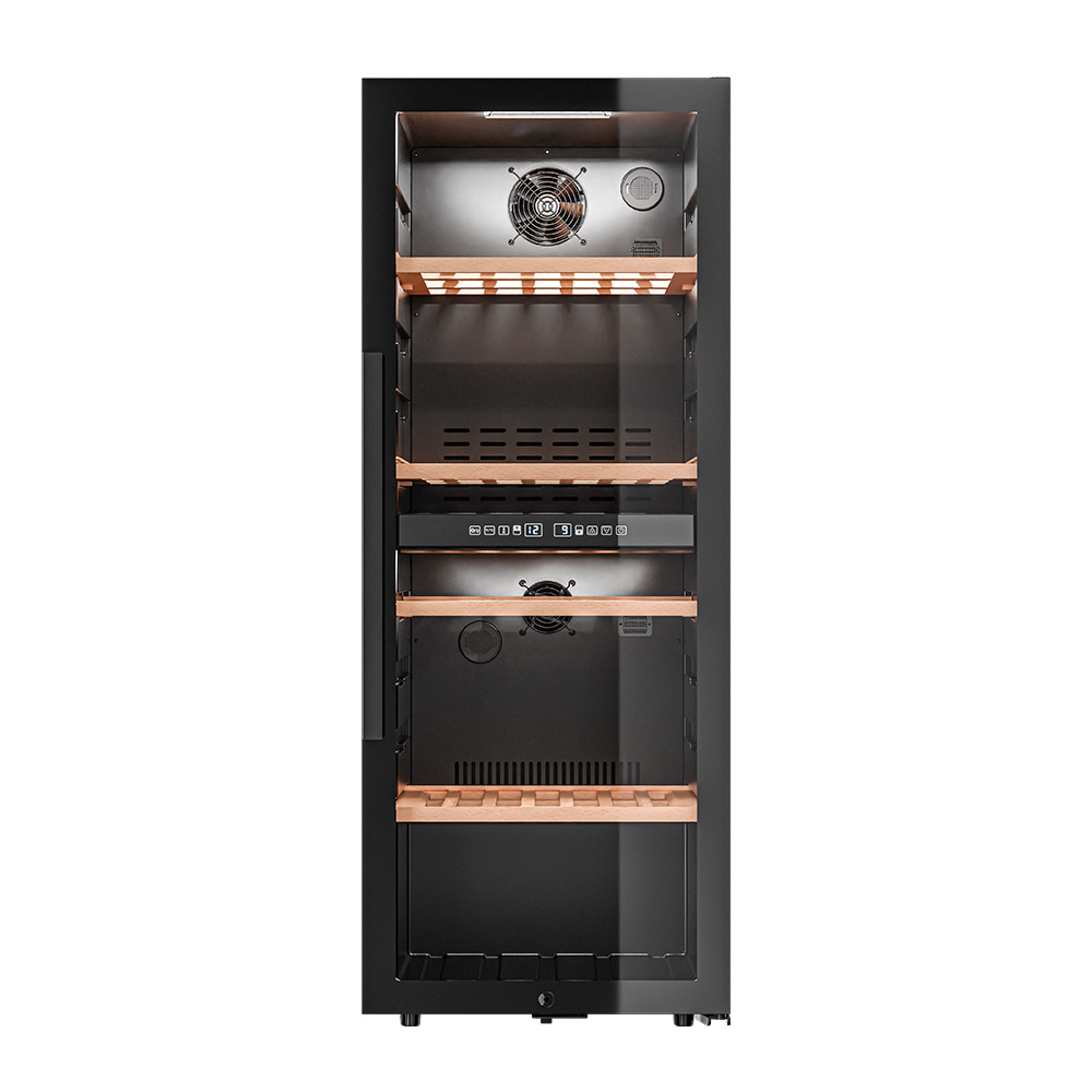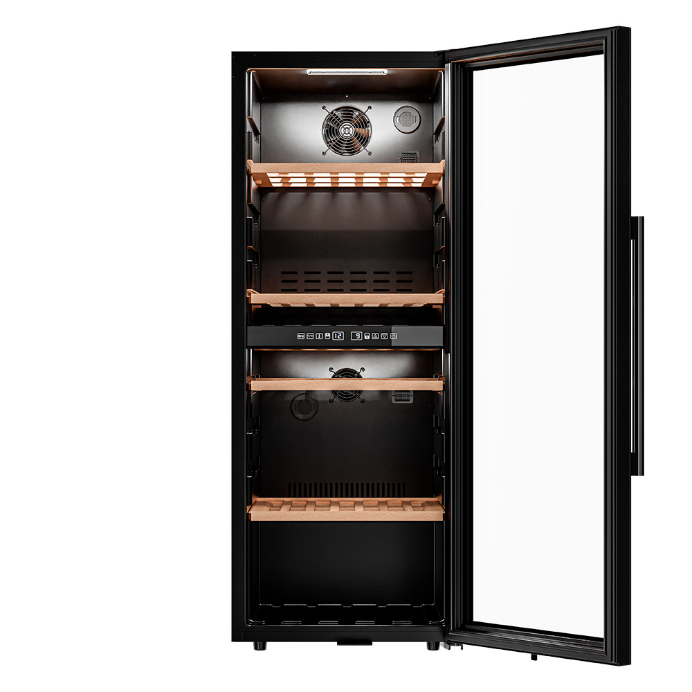 Управление осуществляется через сенсорную панель, а настройка интуитивно понятна. Также предусмотрены важные функции для защиты винотеки: замок на двери для безопасности, угольный фильтр, который очищает воздух внутри шкафа от посторонних запахов, сигнализация отклонения температуры, которая предупреждает о любых изменениях в условиях хранения, и блокировка панели управления, предотвращающая случайные изменения настроек.